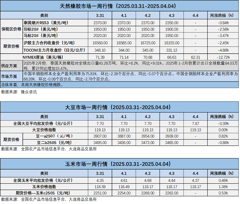 天然橡膠、大豆、玉米市場(chǎng)一周行情(2025.03.31-04.04)