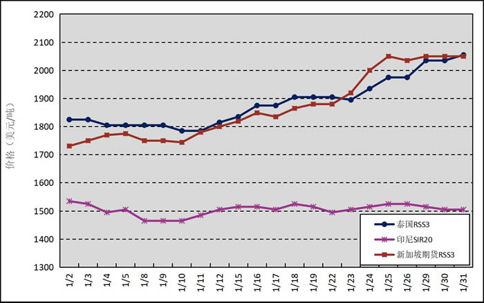 國外主產(chǎn)區(qū):1月,泰國RSS3平均價格為1885美元/噸,環(huán)比上漲158美元/噸,最高價為2055美元/噸,最低價為1785美元/噸;印尼SIR20平均價格為1505美元/噸,環(huán)比上漲71美元/噸,最高價為1535美元/噸,最低價為1465美元/噸;新加坡RSS3期貨主力合約月均結算價格為1870美元/噸,環(huán)比上漲182美元/噸,最高價為2050美元/噸,最低價為1731美元/噸。