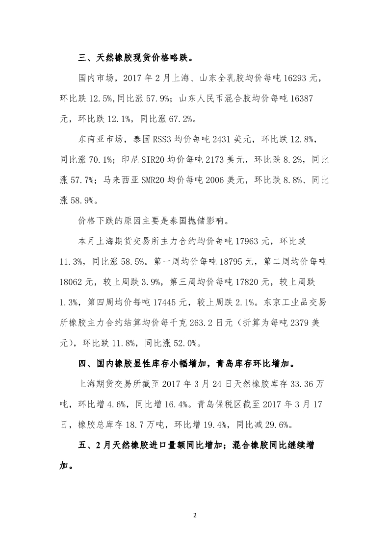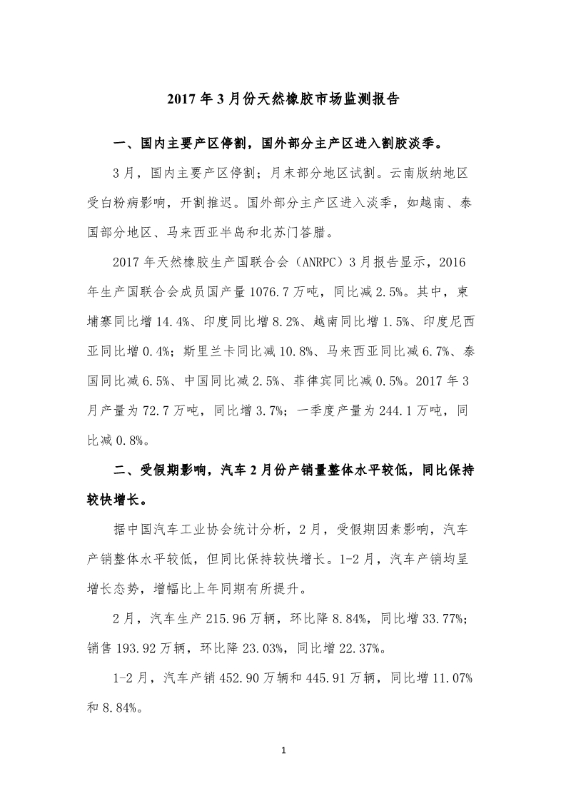 2017年3月份天然橡膠市場監(jiān)測報告