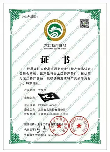 根據(jù)專家審定,“九三”大豆油符合龍江特產食品復審標準,省食品流通商會龍江特產食品認定委員會決定,為九三糧油工業(yè)集團有限公司頒發(fā)標識牌和“龍江特產食品”專用標識許可使用證書。