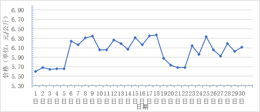 11月,全國(guó)重點(diǎn)監(jiān)測(cè)農(nóng)產(chǎn)品批發(fā)市場(chǎng)香蕉總交易量達(dá)2.6萬噸,同比下降3.7%,環(huán)比基本保持一致;總交易價(jià)值 16391.6萬元,同比上漲8.4%,環(huán)比上漲1.5%。日平均價(jià)格最高為6.3元/千克,最低為5.6元/千克,全月平均價(jià)格為6.0元/千克,同比上漲7.1%,環(huán)比下降1.6%(每日價(jià)格變化如圖)。