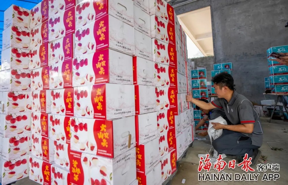 在??谑行阌^(qū)永興鎮(zhèn)的一處荔枝分揀點(diǎn),物流工作人員貼上快遞單。海南日?qǐng)?bào)全媒體記者李天平 攝