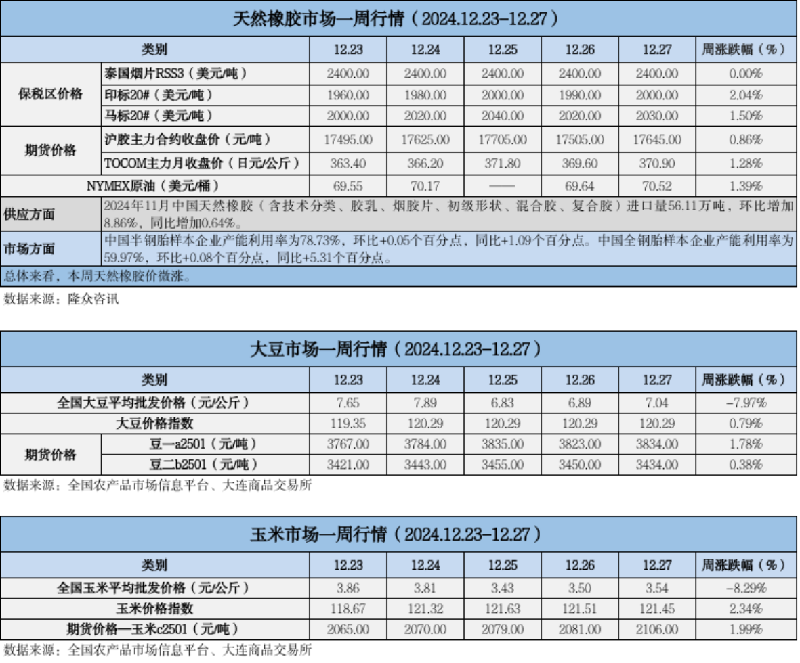 天然橡膠、大豆、玉米市場一周行情(2024.12.23-12.27)