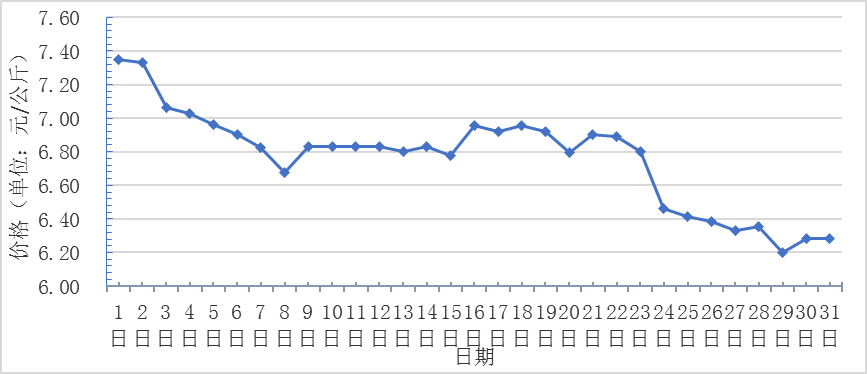 7月,全國重點(diǎn)監(jiān)測農(nóng)產(chǎn)品批發(fā)市場香蕉總交易量達(dá)2.1萬噸,同比上漲5%,環(huán)比下降8.7%;總交易價(jià)值 13613.1萬元,同比上漲6.5%,環(huán)比下降11.3%。日平均價(jià)格最高為7.4元/千克,最低為6.2元/千克,全月平均價(jià)格為 6.8元/千克,同比上漲23.6%,環(huán)比上漲1.5%(每日價(jià)格變化如圖)。