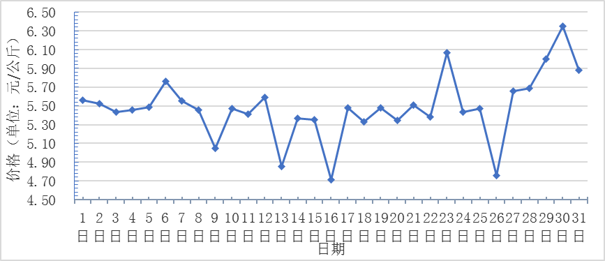 1月,全國重點監(jiān)測農(nóng)產(chǎn)品批發(fā)市場香蕉總交易量達(dá) 2.1萬噸,同比下降12.5%,環(huán)比下降12.5%;總交易價值11082.4萬元,同比下降46.3%,環(huán)比下降17.5%。日平均價格最高為6.4元/千克,最低為4.7元/千克,全月平均價格為5.5元/千克,同比上漲3.8%,環(huán)比下降9.8%(每日價格變化如圖)。