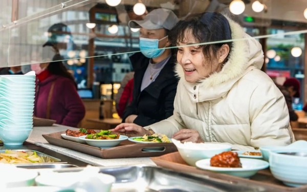 例如,在用餐高峰期專門設(shè)置了長者優(yōu)先區(qū)域,方便老年人快速入座就餐,座椅上還配有“愛心拐杖夾”,方便老人放置拐杖,也避免其他老人誤觸摔倒。