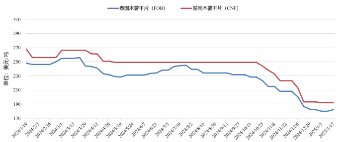 圖1  2024年1月份以來泰國(guó)、越南木薯干片價(jià)格變化情況