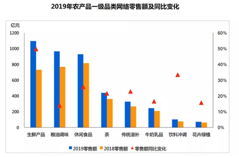 《報(bào)告》數(shù)據(jù)顯示,2019年全國(guó)農(nóng)產(chǎn)品網(wǎng)絡(luò)零售額達(dá)4168.6億元,其中生鮮產(chǎn)品消費(fèi)占比在飛速上升。同期生鮮產(chǎn)品網(wǎng)絡(luò)零售額超過(guò)1094.9億元,網(wǎng)絡(luò)零售量同比增加78.4%,成為規(guī)模最大、增速最快的類(lèi)目。