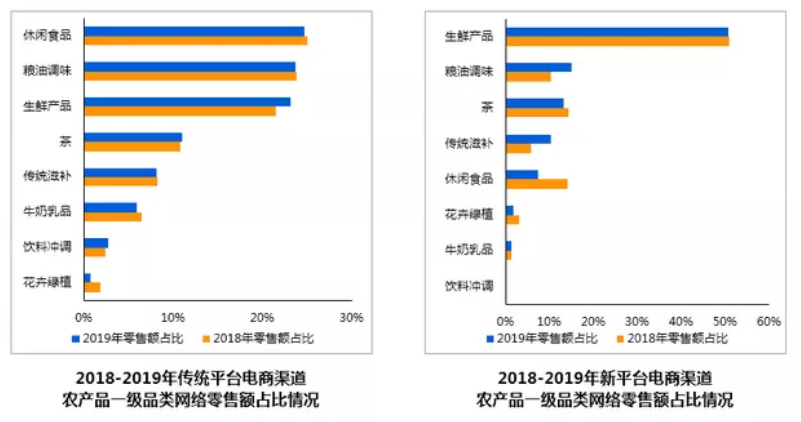 《報(bào)告》分析,傳統(tǒng)電商平臺(tái)中,農(nóng)產(chǎn)品網(wǎng)絡(luò)銷(xiāo)售前三大品類(lèi)依次為休閑食品、糧油調(diào)味、生鮮產(chǎn)品,占比分別為25%、23.8%、21.5%。但以拼多多為代表的新電商平臺(tái)以及新零售渠道中,生鮮產(chǎn)品的網(wǎng)絡(luò)零售額占比均超過(guò)50%,而傳統(tǒng)電商平臺(tái)生鮮產(chǎn)品零售額占比不足25%。