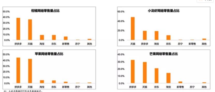 同時(shí),在蘋(píng)果、柑橘、芒果品類(lèi)的網(wǎng)絡(luò)零售量分布中,來(lái)自拼多多等新電商平臺(tái)的渠道占比分別達(dá)44.35%、38.6%、32.2%,均排名第一。在“網(wǎng)紅單品”小龍蝦品類(lèi)中,傳統(tǒng)電商平臺(tái)仍占絕對(duì)優(yōu)勢(shì),但新電商平臺(tái)消費(fèi)增長(zhǎng)迅速,渠道占比已躍居第二。