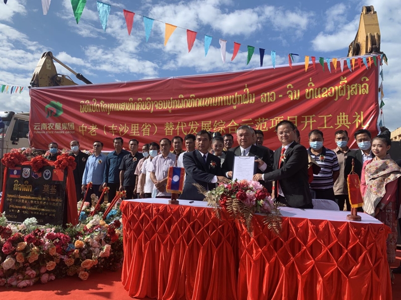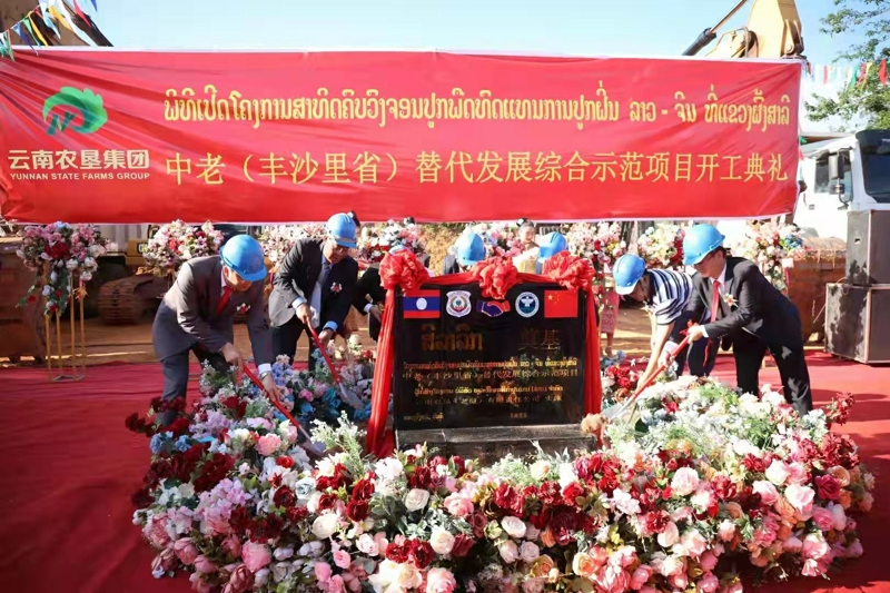 10月12日,云南農(nóng)墾集團(tuán)聯(lián)合老撾豐沙里省政府在豐沙里約烏縣勐烏鄉(xiāng)小寨村舉行“中老(豐沙里?。├浰谔娲l(fā)展綜合示范項(xiàng)目”開工奠基儀式,標(biāo)志著中老兩國(guó)第一個(gè)國(guó)家級(jí)罌粟替代發(fā)展綜合示范項(xiàng)目正式啟動(dòng)。