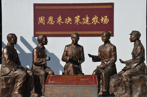 進(jìn)入大院便是奮進(jìn)園,周恩來(lái)總理和幾位墾荒者的巨型雕塑矗立其中。巨雕西面是群體雕塑“周恩來(lái)決策建農(nóng)場(chǎng)”;東面是一條綠樹(shù)掩映的半圓形文化長(zhǎng)廊,展出著農(nóng)場(chǎng)各個(gè)時(shí)期的珍貴照片;南面是“福滿路”,路上錯(cuò)落分布著五個(gè)巨大的蘋果門,每個(gè)門上各有一種糧食作物的圖案,寓意平平安安、五谷豐登。福滿路兩側(cè)立著24節(jié)氣石牌。
