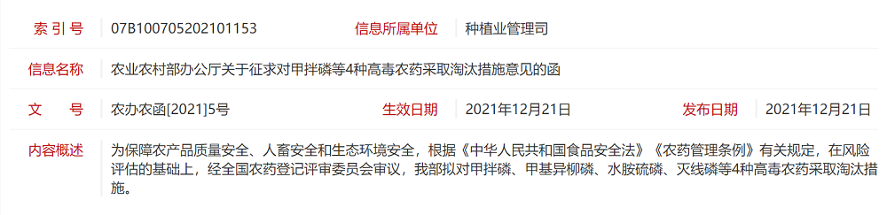 現(xiàn)對以上淘汰措施公開征求意見。請于2022年1月21日前將意見以書面或電子郵件形式反饋我部農(nóng)藥管理司。
