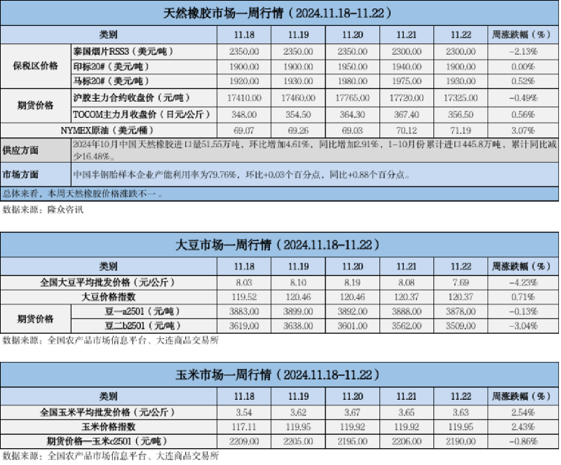 天然橡膠、大豆、玉米市場一周行情(2024.11.18-11.22)