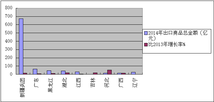 2014年全國農(nóng)墾農(nóng)產(chǎn)品出口排名前十的墾區(qū)是:新疆兵團(tuán)、廣東、黑龍江、湖北、江西、遼寧、廣西、河北、上海、北京。十大墾區(qū)出口商品總金額合計926.49億元,占全國農(nóng)墾出口商品總金額944.84億元的98.06%。