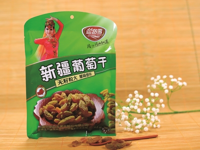 絲路雪葡萄干,原料多來自無核白葡萄,又名“無籽露”,中晚熟品種,味道很甜,制干品質(zhì)優(yōu)良,也可釀酒。橢圓形,黃白色,皮薄脆;果肉淺綠色,半透明,肉脆,味甜,汁少,無香味。含糖量22.4%,含酸量0.4%,品質(zhì)優(yōu)良。果實出干率20%~30%。十三師種植有10萬畝地,葡萄干產(chǎn)量3萬噸左右。