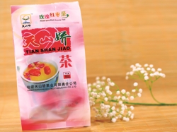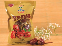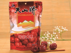 天山嬌干棗,原料多來自哈密大棗。哈密大棗是中國紅棗家族中一個相對獨立的優(yōu)良品種,是在新疆哈密由南平原戈壁特定氣候條件下經(jīng)長期馴化生成的果中珍品。古代謂之“香棗”,一直是獻(xiàn)給朝廷的上乘西域貢品。據(jù)史料考證,哈密栽培大棗已有兩千年的歷史,以其個大、皮薄、核小、肉厚、顏色好、含糖量高、干而不皺等優(yōu)點,在國內(nèi)外市場上馳名。