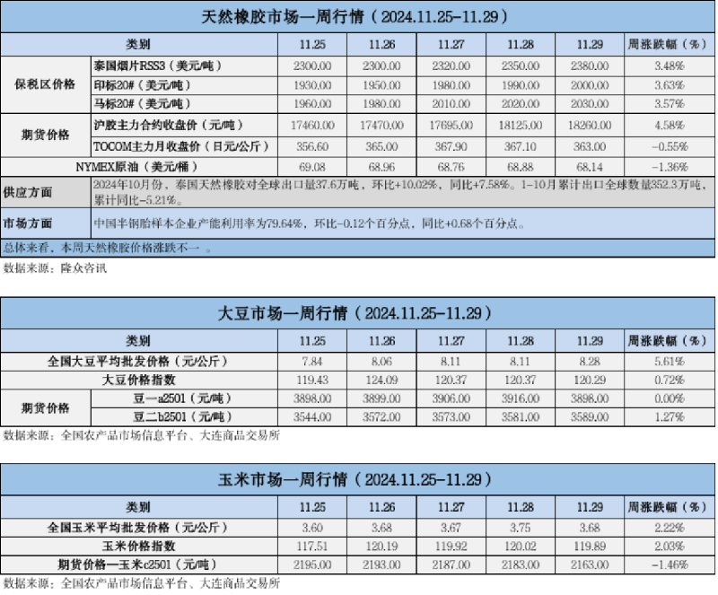 天然橡膠、大豆、玉米市場一周行情(2024.11.25-11.29)