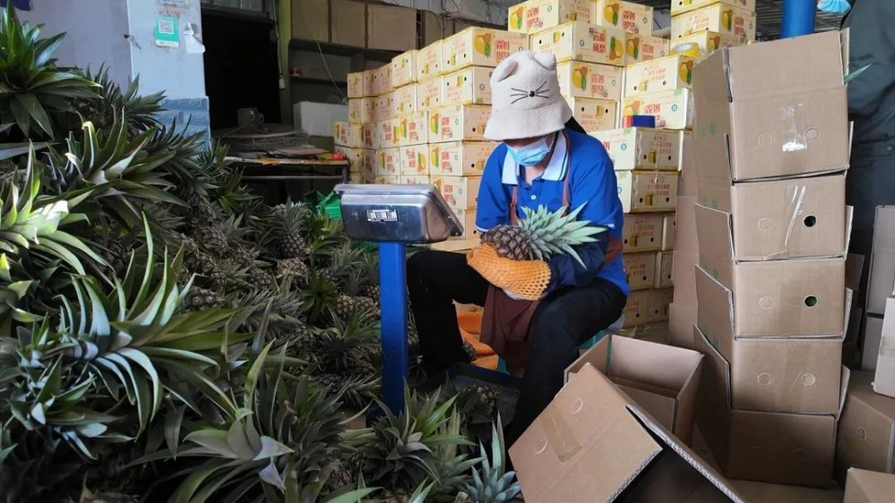 “我們的鳳梨在市場上非常暢銷,每天‘線上+線下’要發(fā)20噸左右,我身后的這輛車就是馬上要發(fā)往貴州的?!焙献魃缲?fù)責(zé)人蔣紅艷說。