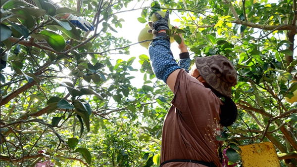 果農(nóng)正在采摘柚子。