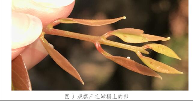 當(dāng)荔枝樹進(jìn)入抽梢期時,對果園進(jìn)行實地調(diào)查,每個果園按東南西北中五個方位進(jìn)行定點監(jiān)測,每個方位取5株樹,每株樹隨機取5~10個枝條,觀察荔枝嫩梢上的卵數(shù)量(圖3),當(dāng)卵數(shù)量達(dá)30%時,3~4天后則施藥進(jìn)行防治。