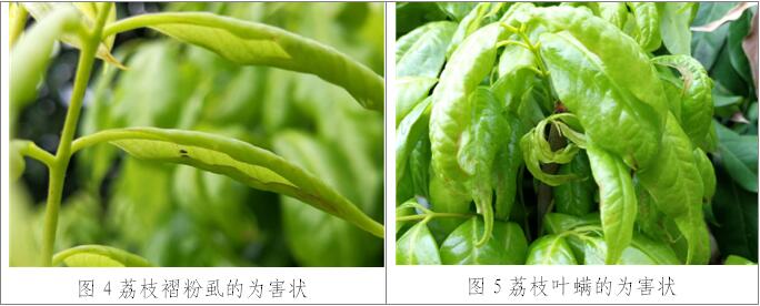 成蟲和若蟲以刺吸式口器在嫩梢的葉片上吸食為害,嚴(yán)重影響嫩梢的生長。荔枝褶粉虱一般在葉背為害,造成葉內(nèi)卷,為害嚴(yán)重時,葉面會出現(xiàn)黃色斑點。該蟲的排泄物可誘發(fā)煤煙病,影響葉片光合作用。荔枝褶粉虱主要發(fā)生在通透性差的密閉果園,在通風(fēng)透光良好的間伐果園,該蟲則為害較輕。而荔枝葉螨于葉面為害,葉片細(xì)胞被破壞而喪失葉綠素,造成葉片呈現(xiàn)黃白色小斑點,嚴(yán)重時造成葉片卷曲、變褐至落葉。