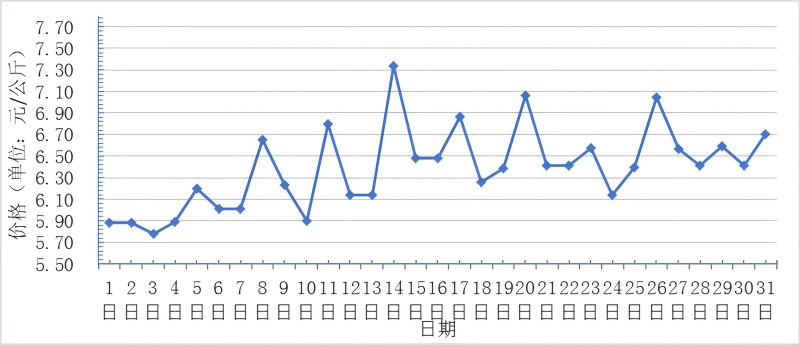 8月,全國重點(diǎn)監(jiān)測(cè)農(nóng)產(chǎn)品批發(fā)市場(chǎng)香蕉總交易量達(dá)3.4萬噸,同比上漲47.8%,環(huán)比上漲47.8%;總交易價(jià)值20902.6萬元,同比上漲44.1%,環(huán)比上漲63.9%。日平均價(jià)格最高為7.3元/千克,最低為5.8元/千克,全月平均價(jià)格為 6.4元/千克,同比上漲4.9%,環(huán)比上漲8.5%(每日價(jià)格變化如圖)。
