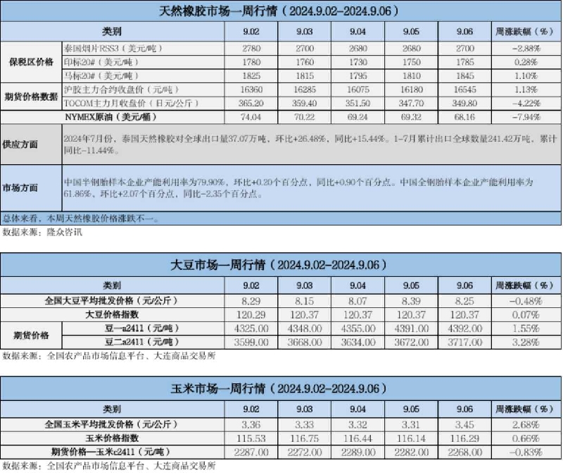 天然橡膠、大豆、玉米市場一周行情(2024.09.02-09.06)