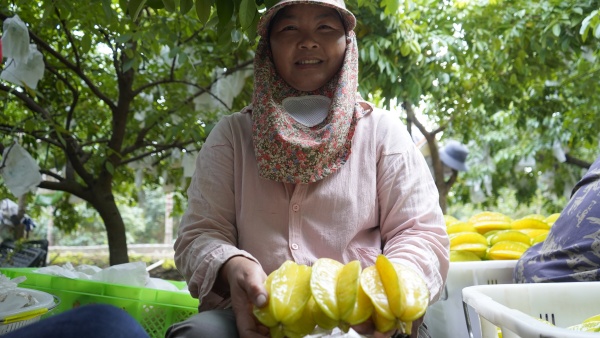 來(lái)自成都的旅居游客邱阿姨和同伴也被香甜誘人的楊桃吸引,直接進(jìn)到地里購(gòu)買?!霸?jiǎn)直是人間寶藏!水果又多又好。上次來(lái)那路村游玩,品嘗到黃澄澄的楊桃,就一直記著這個(gè)味道,這次就迫不及待直接來(lái)地里回購(gòu)!這些楊桃?guī)Щ厝?,家里人肯定高興。”邱阿姨一邊說(shuō)一邊挑選著楊桃。刀紹沙則幫顧客分揀、包裝好,并叮囑存放竅門(mén)。