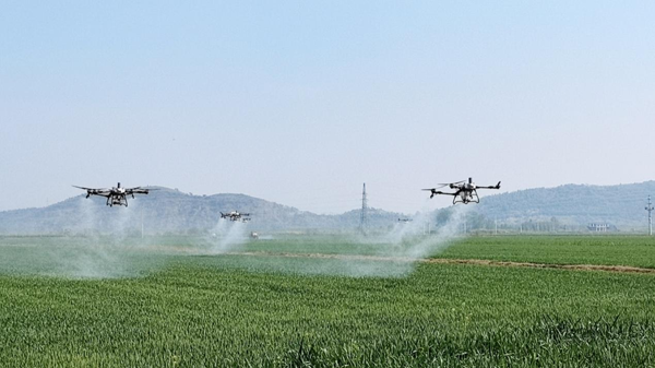 壽西湖農(nóng)場搶在小麥抽穗八成至齊穗揚(yáng)花期啟動(dòng)首輪 “一噴三防”工作,組織100多臺(tái)套植保無人機(jī)和自走式植保機(jī)協(xié)同作業(yè)。(董 云)