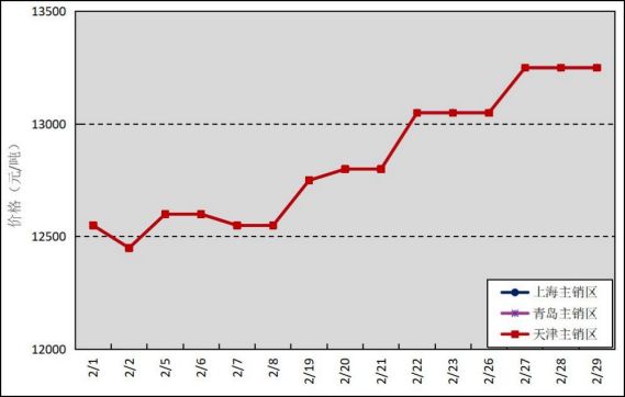 國內(nèi)主銷區(qū):2月,國產(chǎn)全乳標準膠上海市場平均價格12837元/噸,環(huán)比上漲21元/噸,最高價為13250元/噸,最低價為12450元/噸;青島市場平均價格12837元/噸,環(huán)比上漲21元/噸,最高價為13250元/噸,最低價為12450元/噸;天津市場平均價格12837元/噸,環(huán)比上漲21元/噸,最高價為13250元/噸,最低價為12450元/噸。