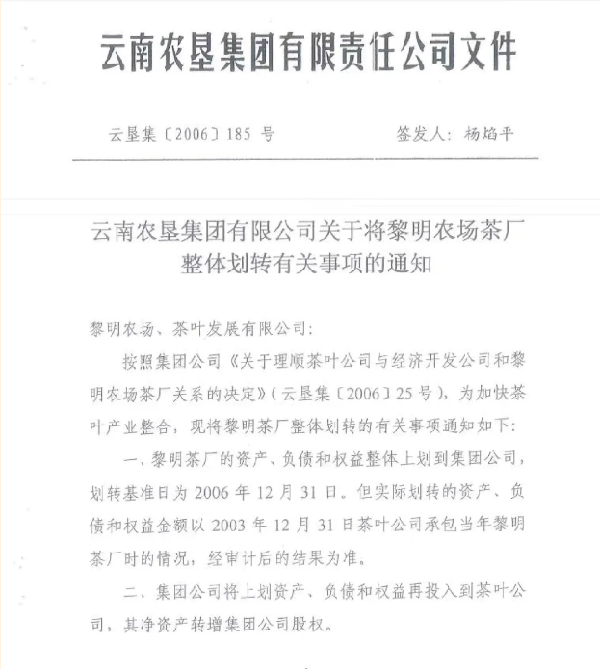 2004年,黎明茶廠(chǎng)全面轉(zhuǎn)型,生產(chǎn)加工普洱茶。與云南省黎明農(nóng)工商聯(lián)合公司協(xié)商一致,報(bào)云南省農(nóng)墾總局同意,由云南農(nóng)墾茶葉發(fā)展有限公司承包經(jīng)營(yíng)云南省黎明農(nóng)工商聯(lián)合公司茶廠(chǎng)。
