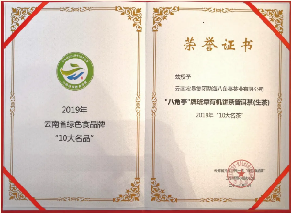 2019年,云南農(nóng)墾集團(tuán)勐海八角亭茶業(yè)有限公司“八角亭”牌“班章有機(jī)餅茶”榮獲云南省“10大名茶”稱(chēng)號(hào);公司被評(píng)為云南省農(nóng)業(yè)產(chǎn)業(yè)化經(jīng)營(yíng)省級(jí)重點(diǎn)龍頭企業(yè);榮獲云南省“五一勞動(dòng)獎(jiǎng)狀”。