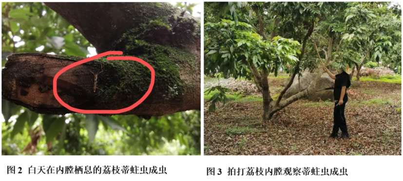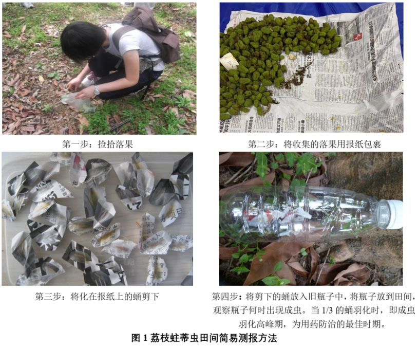 一、監(jiān)測方法:1.監(jiān)測落果中荔枝蒂蛀蟲的發(fā)育進度,預測蒂蛀蟲成蟲羽化高峰期。根據(jù)蒂蛀蟲田間簡易測報方法(如圖1),連續(xù)7-10天撿拾地下落果,收集并用一層報紙包裹,數(shù)日后剪下在報紙化蛹的荔枝蒂蛀蟲(蛹),置于空礦泉水瓶中,待瓶中有1/3的蛹羽化為成蟲,即為成蟲羽化高峰期,可用藥防治。2.監(jiān)測樹干上荔枝蒂蛀蟲成蟲。根據(jù)蒂蛀蟲成蟲白天棲于陰涼的樹冠內枝桿上(如圖2),受到驚嚇時會飛離枝桿這一特性,于每天清晨對果園進行實地調查,每個果園按東南西北中五個方位進行定點監(jiān)測,每個方位取10-15株樹,在荔枝內膛拍打莖桿(如圖3),發(fā)現(xiàn)有成蟲時,即可用藥防治。
