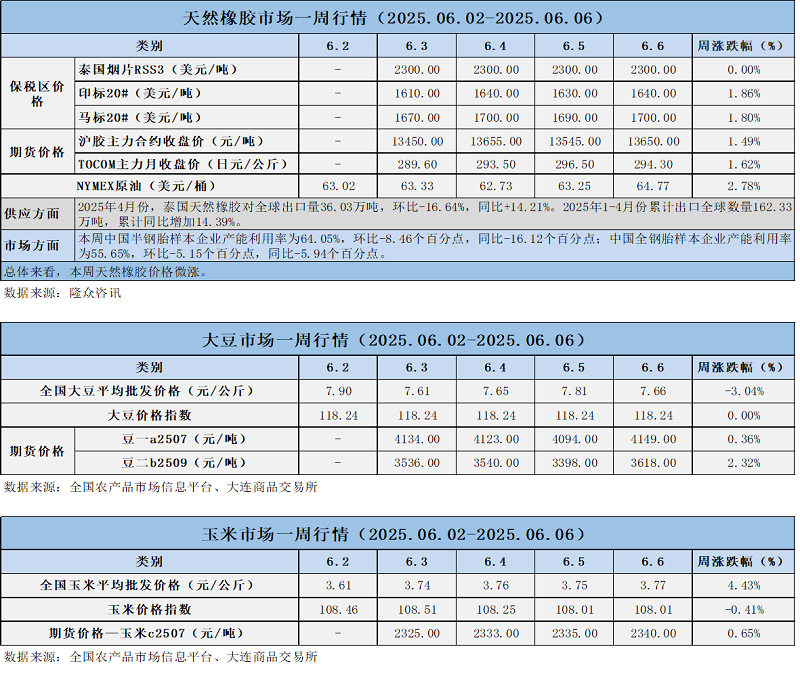 天然橡膠、大豆、玉米市場(chǎng)一周行情(2025.06.02-06.06)