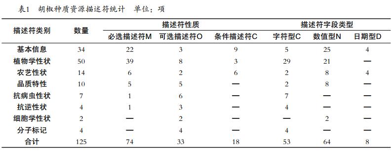 基本信息數(shù)據(jù)對于種質(zhì)資源研究和共享利用至關(guān)重要。按照植物種質(zhì)資源共性描述規(guī)范的原則要求,統(tǒng)一種質(zhì)資源共性信息,統(tǒng)一描述項(xiàng)目。胡椒種質(zhì)資源規(guī)定了34項(xiàng)基本信息描述符,主要包括種質(zhì)圃編號、采集號、引種號、種質(zhì)名稱、科名、屬名、學(xué)名、種質(zhì)類型、主要特性、主要用途、系譜、育種手段、繁殖方式、采集地、保存單位、圖像和鑒定評價(jià)機(jī)構(gòu)等,涉及征集、保存、主要特征、用途及共享等多方面內(nèi)容。由于胡椒種質(zhì)資源在國內(nèi)外均有分布,且野生近緣種資源占有較大比例,因此條件描述符5項(xiàng),主要涉及采集地位置信息以及引種號和引種外文名,其余29項(xiàng)為必選描述符,均是具有共性的種質(zhì)基本特征及主要特征等(表1)。