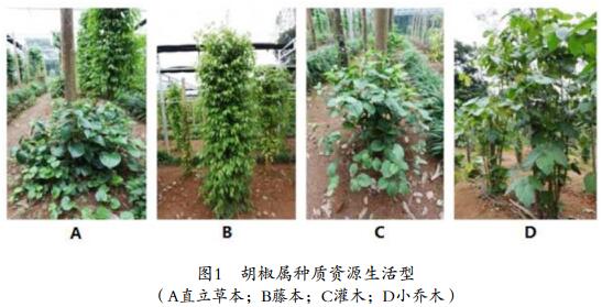 胡椒植物學(xué)特征描述符主要從植株、莖、葉、花和花序、果和果序、種子等特征特性進(jìn)行分別描述,共51項(xiàng),主要包括生活型、株高、冠幅、莖顏色、分枝特性、葉顏色、葉形、葉脈類型、葉脈數(shù)量、葉背被毛、花序形狀、苞片形狀、雄蕊數(shù)量、柱頭數(shù)量、果序長度、果實(shí)著生情況及種子千粒重等。對于質(zhì)量性狀描述,通過盡可能多的調(diào)查不同種質(zhì)資源,采集標(biāo)本并拍照作圖,采用歸納整理和分類的方法,把同一性狀的不同表現(xiàn)形態(tài)進(jìn)行列項(xiàng),并通過圖像形式進(jìn)行直觀顯示,使該標(biāo)準(zhǔn)具有較好的實(shí)用性和可操作性。對于數(shù)量性狀描述,確定測量方法,并根據(jù)資料、實(shí)地測量,分析數(shù)據(jù)后給出評價(jià)指標(biāo)。在確定描述符時,生活型、葉脈類型、葉脈數(shù)量、果序長度、苞片形狀和果實(shí)著生情況等指標(biāo)具有一定的特殊性。由于復(fù)雜起源和快速分化,胡椒屬內(nèi)極高的物種多樣性使其成為基部被子植物中最大的屬之一,物種多樣性極為豐富[13],植株外貌特征類型多樣,如原產(chǎn)于南美洲的毛葉樹胡椒(P. hispidinervium)等為小喬木,苧葉蒟(P. boehmeriaefolium)、樟葉胡椒(P.polysyphorum)等為灌木,胡椒(P. nigrum)、短蒟(P.mullesua)等為木質(zhì)藤本,蓽菝(P. longum)等為草質(zhì)藤本,而假蒟(P. sarmentosum)、P.auntum等為直立草本,因此將生活型作為描述及評價(jià)指標(biāo),并根據(jù)植株外觀特征確定了4種類型(圖1)。