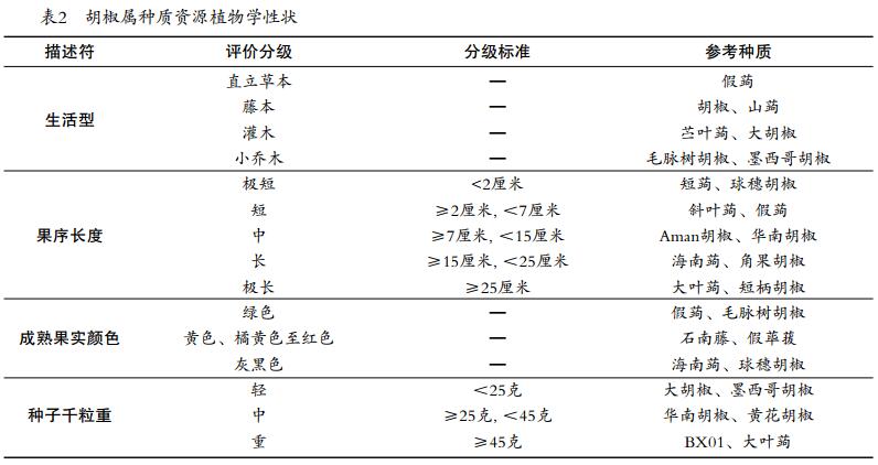 為確保胡椒種質(zhì)資源研究的順利開展,結(jié)合前期研究基礎(chǔ)及相關(guān)資料,我們研究制定了一套適用于我國胡椒種質(zhì)資源研究的描述符,為種質(zhì)資源收集保存、鑒定評價(jià)與創(chuàng)新利用的標(biāo)準(zhǔn)化和信息化提供保障。