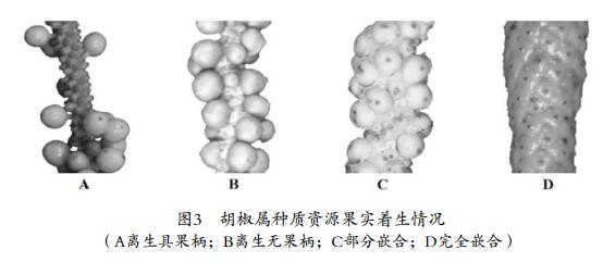 果序長度是產(chǎn)量相關(guān)的一個重要副性狀。由于胡椒屬物種的多樣性,果序長度也表現(xiàn)出了極高的差異性,如球穗胡椒(P.thomsonii)等種質(zhì)果穗不足2厘米,而大葉蒟(P.laetispicum)和短柄胡椒(P.stipitiforme)果穗可長達(dá)25厘米以上,因此將果序長度分為極短、短、中、長、極長共5個類別(表2)。果實(shí)著生情況是指果實(shí)在果序軸上的著生情況,胡椒屬物種的果實(shí)著生情況具有一定差異,如大葉蒟等果實(shí)與果序軸離生并具果柄,山蒟(P. hancei)等果實(shí)與果序軸離生但不具果柄,華南胡椒(P. austrosinense)等果實(shí)部分嵌合在果序軸中,而假蓽菝(P. retrofractum)等果實(shí)完全嵌合在果序軸中,據(jù)此確定了4種果實(shí)著生情況(圖3)。