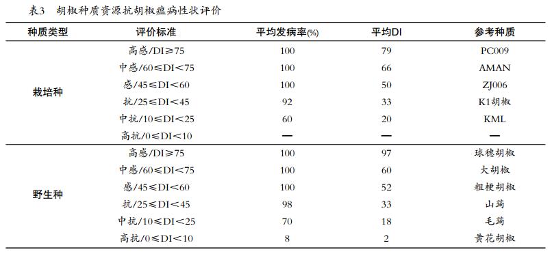 抗病蟲種質(zhì)資源挖掘利用可提高栽培品種抗病蟲特性,是實(shí)現(xiàn)生態(tài)、綠色乃至有機(jī)栽培的物質(zhì)基礎(chǔ)。胡椒抗病蟲性狀描述符共7項(xiàng),其中胡椒瘟病抗性為必須描述符,其他6項(xiàng)為可選描述符。胡椒瘟病是由辣椒疫霉菌(Phytophthora capsici)引起的一種氣候依賴型、傳染力很強(qiáng)的土傳性病害,目前尚未選育出有效的抗病品種[13]。我國胡椒主栽品種屬于易感瘟病品種,生產(chǎn)上仍采取預(yù)防為主、綜合防治為輔的措施,勞動力成本高[15]。研究者一直都把胡椒瘟病抗性列為主要育種目標(biāo)。近20年來,中國熱帶農(nóng)業(yè)科學(xué)院香料飲料研究所等單位開展了胡椒種質(zhì)資源瘟病抗性鑒定研究,離體葉片針刺接種法操作簡單有效,且評價(jià)結(jié)果與其他方法的測定結(jié)果基本一致[5]。選擇植株中部最外側(cè)小枝頂芽下第3~5片、無病蟲害、生長正常的穩(wěn)定葉片,洗凈后消毒處理;分離病原菌,純化培養(yǎng)獲得致病菌株,經(jīng)培養(yǎng)基28℃培養(yǎng)后,配成孢子濃度為10萬~100萬個/mL的懸浮液;用束針刺傷葉片,將接種菌液均勻噴灑在葉片正反面,28℃保濕培養(yǎng),調(diào)查病情,制定免疫(I)、高抗(HR)、抗(R)、中抗(MR)、感(S)和高感(HS)共6級抗病性評價(jià)標(biāo)準(zhǔn)(表3)。