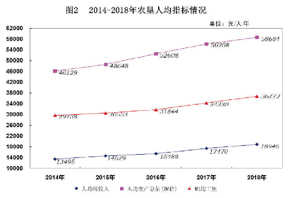 全年農(nóng)墾經(jīng)濟實現(xiàn)生產(chǎn)總值8157.20億元(見圖1)。其中,第一產(chǎn)業(yè)增加值1887.75億元;第二產(chǎn)業(yè)增加值3516.68億元;第三產(chǎn)業(yè)增加值2752.77億元。第一、第二、第三產(chǎn)業(yè)增加值占農(nóng)墾生產(chǎn)總值的比重分別為23.1%、43.1%和33.7%。人均生產(chǎn)總值58684元;人均純收入持續(xù)增長,達(dá)到18946元,比上年增長8.4%(見圖2)。