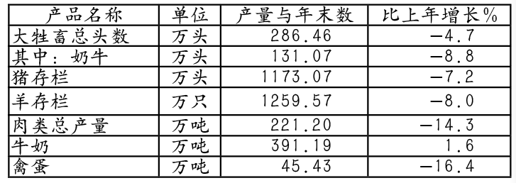 畜牧業(yè)占農(nóng)業(yè)總產(chǎn)值比重為20.4%,比去年下降1.8個百分點;牲畜年末存欄總數(shù)及主要畜產(chǎn)品產(chǎn)量(見表2)。