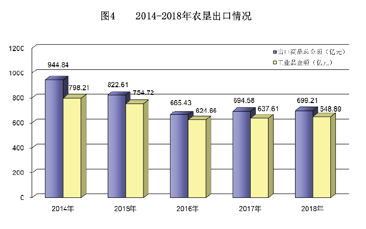 全年出口供貨商品總金額699.21億元(見圖4),比上年增加4.63億元,增長0.7%。出口商品供貨總額超過10億元的墾區(qū)分別是:新疆兵團473.07億元、廣東77.65億元、湖北40.96億元、江西37.07億元、河北24.27億元、廣西10.04億元,上述6個墾區(qū)出口金額合計達(dá)663.06億元,占全國農(nóng)墾出口商品總金額的94.8%。
